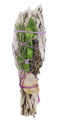 Aura Cleansing Sage Torch (with Citrine) 10 cm is een 10 cm lange salietorch met citrien, ontworpen voor ruimtezuivering en het stimuleren van positieve energie. Geeft een frisse, houtige geur met een vleugje citrus en kristallijne helderheid. Gebruik in een hittebestendige houder: steek aan, laat kort vlammen, laat zacht gloeien en blaas uit zodat het rookt. Ventileer de ruimte en houd brandbare materialen buiten bereik.